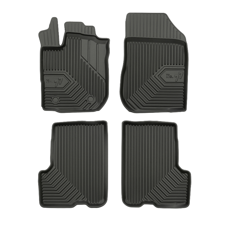 Guminiai Premium 77 kilimėliai: (aukštos kokybės plastiko, gumos mišinys / TPE, komplektas – 4vnt., juodi, krašto aukštis 4 cm, montavimo būdas – spaustukai).