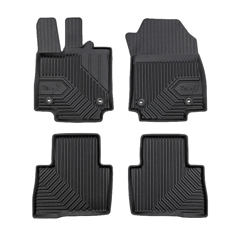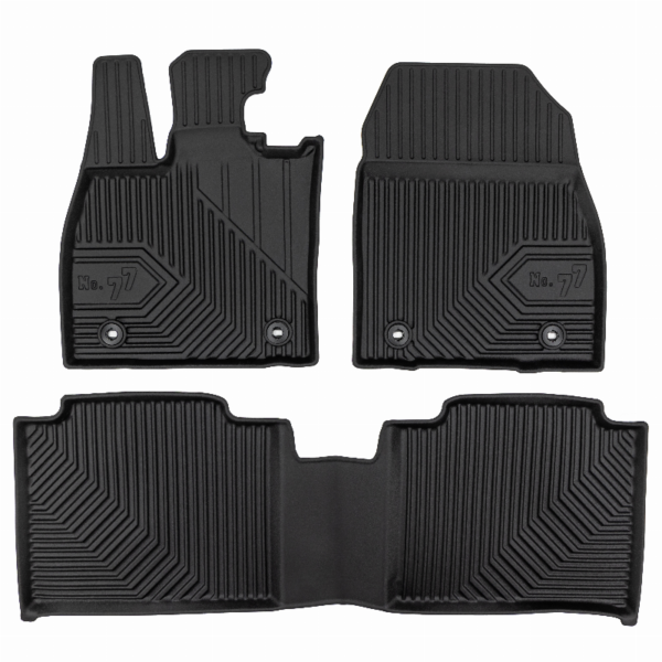 Guminiai Premium 77 kilimėliai: (aukštos kokybės plastiko, gumos mišinys / TPE, komplektas – 4vnt., juodi, krašto aukštis 4 cm, montavimo būdas – spaustukai).