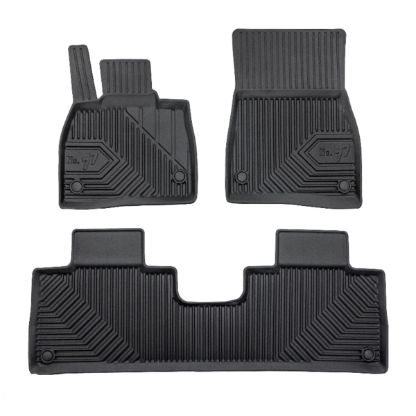 Guminiai Premium 77 kilimėliai: (aukštos kokybės plastiko, gumos mišinys / TPE, komplektas – 4vnt., juodi, krašto aukštis 4 cm, montavimo būdas – spaustukai).