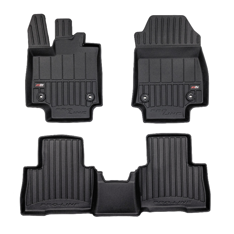 Guminiai ProLine 3D kilimėliai: (aukštos kokybės plastiko, gumos mišinys / TPE, komplektas – 3vnt., juodi, krašto aukštis 7 cm, montavimo būdas – spaustukai).