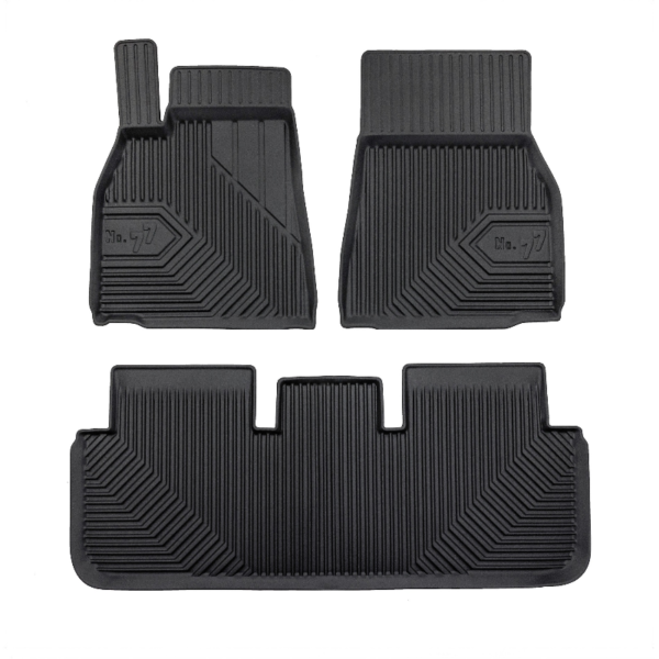 Guminiai Premium 77 kilimėliai: (aukštos kokybės plastiko, gumos mišinys / TPE, komplektas – 3vnt., juodi, krašto aukštis 4 cm, montavimo būdas – spaustukai).