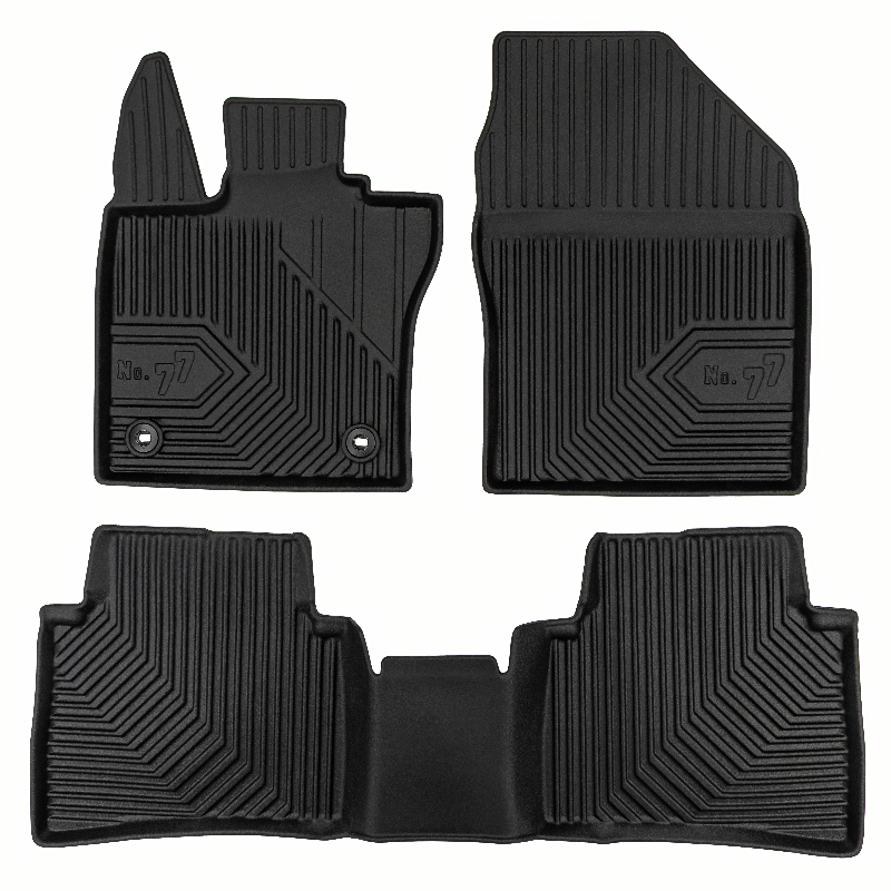 Guminiai Premium 77 kilimėliai: (aukštos kokybės plastiko, gumos mišinys / TPE, komplektas – 3vnt., juodi, krašto aukštis 4 cm, montavimo būdas – spaustukai).