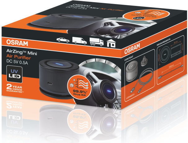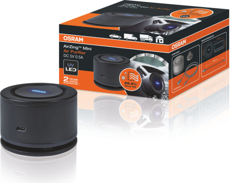 „OSRAMs AirZing Mini“ yra elektrinis 12V katalizinis oro valiklis, kuris išvalo iš oro 99.9 % virusų. Osram „AirZing Mini“ pritraukia orą ir praleidžia jį per titano dioksido plokštelę, kuri kartu su UV-A šviesa sukelia fotoninę-katalizinę reakciją. Ši reakcija pašalina kenksmingas bakterijas ir virusus iš oro. Valymo procesas pašalina blogus kvapus, paliekant vairuotojui gryną orą. Titano dioksido plokštelę retkarčiais reikia išimti, nuplauti, kad būtų atliekama nedidelė priežiūra ir nereikėtų nuolat pirkti ir keisti filtrus. Sukurtas specialiai naudoti transporto priemonėje Osram, „AirZing Mini“ yra su magnetiniais ventiliacijos spaustukais, kad oro valiklio montavimas būtų nesudėtingas. USB-C maitinimo laido šaltinis saugiai pritvirtinamas važiuojant.