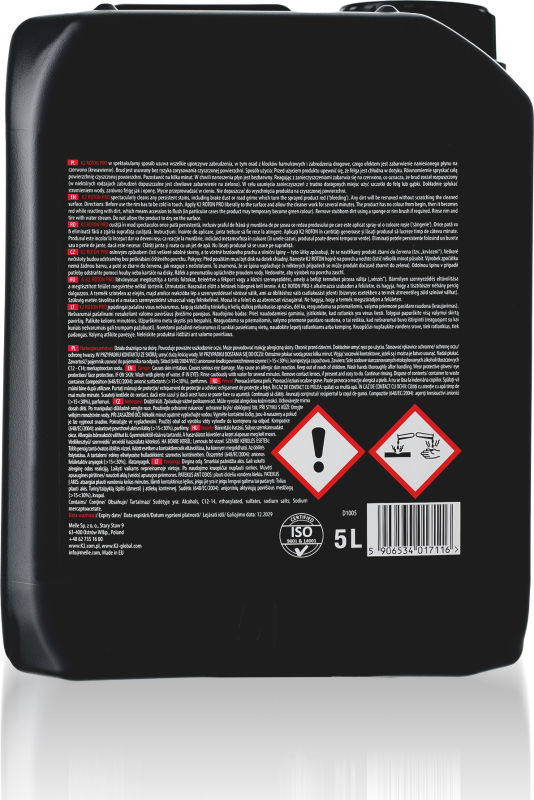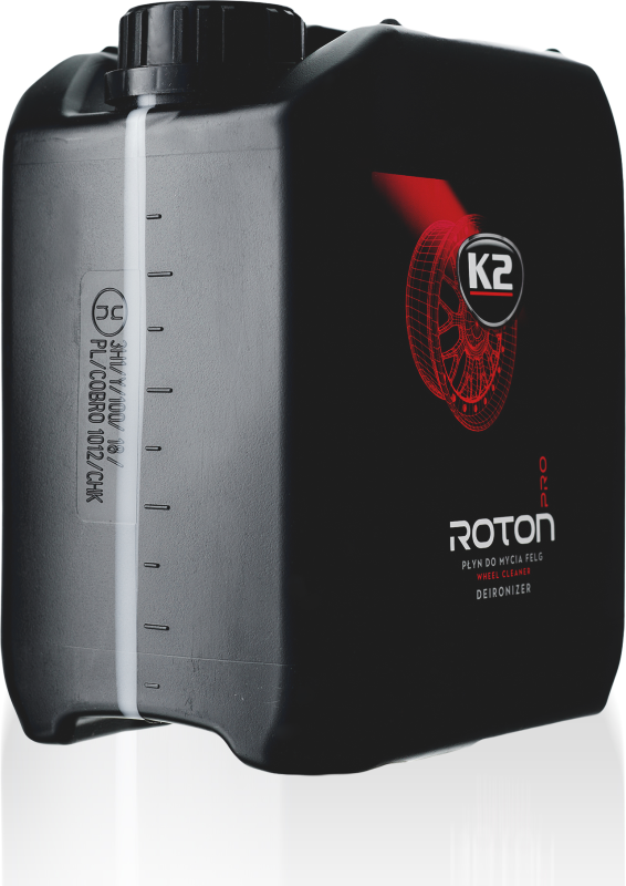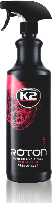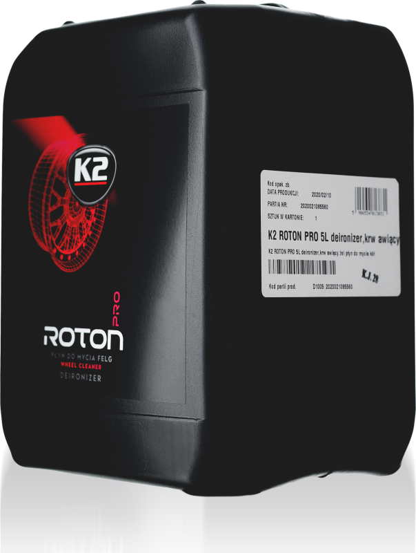 K2 “ROTON PRO” yra itin koncentruotas ir proferionalus ratlankių valiklis. Puiki gelio konsistencija įspūdingai pašalina nešvarumus iš aliuminių, chromuotų ir dažytų ratų. Storas gelio sluoksnis lengvai pašalina dumblą ir kelio nešvarumus iš stabdžių trinkelių. Raudonas „kraujavimo efektas“ įrodo cheminę reakciją su nešvarumais, parodo valymo efektyvumą ir leidžia valdyti valymo procesą. Galingas, efektyvus ir saugus dažytiems elementams, gumai ar plastikams. Jo pH yra neutralus ir gali būti naudojamas kaip deironizatorius dažytų elementų valymui nuo metalinių teršalų.