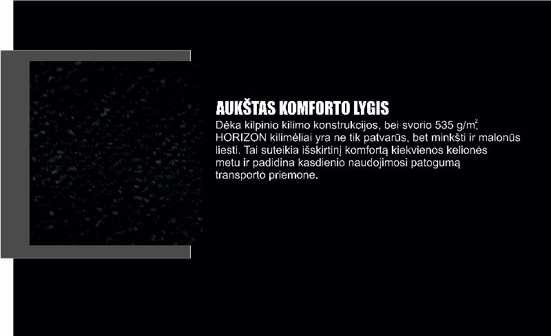 Dėka kilpinio kilimo konstrukcijos, bei svorio 535 g/m², HORIZON kilimėliai yra ne tik patvarūs, bet ir minkšti, ir malonūs liesti. Tai suteikia išskirtinį komfortą kiekvienos